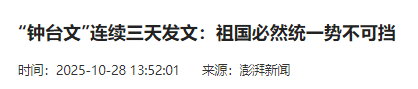 10月28日,新华社刊发“钟台文”署名文章《祖国必然统一势不可挡》。这也是26日以来“钟台文”第三篇关于台湾问题的文章。