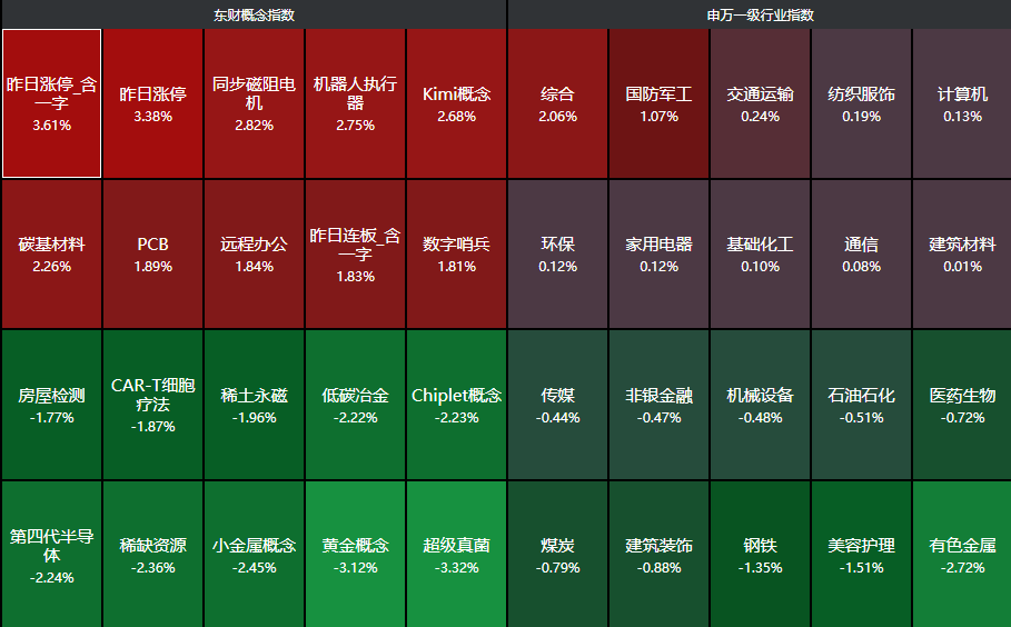 分行业来看,综合、国防军工、交通运输、纺织服饰、计算机等行业领涨,有色金属、美容护理、钢铁等行业领跌。