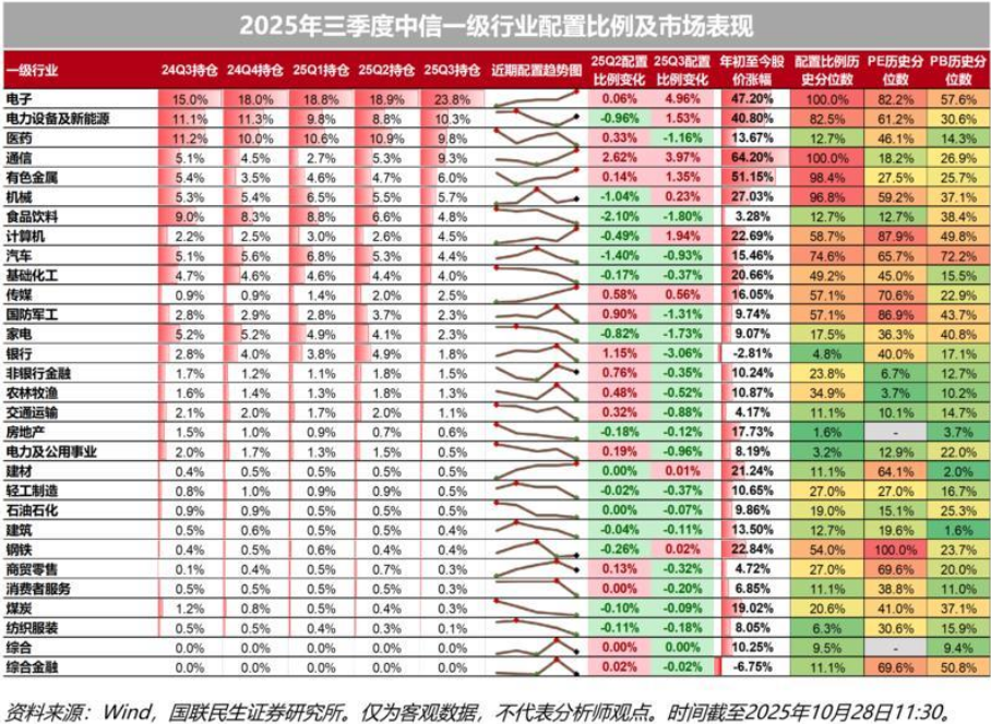 公募基金三季报披露了差不多了,据初步统计,公募基金三季度对电子、通信、计算机、电新、有色、传媒、机械等行业增持较多,其中电子行业持仓超过20%,一般来说超过20%可能有拥挤度过高的风险。