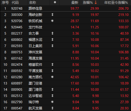 福建省相关板块掀起涨停潮,海通发展、厦门空港、厦门港务、漳州发展等多股涨停。
